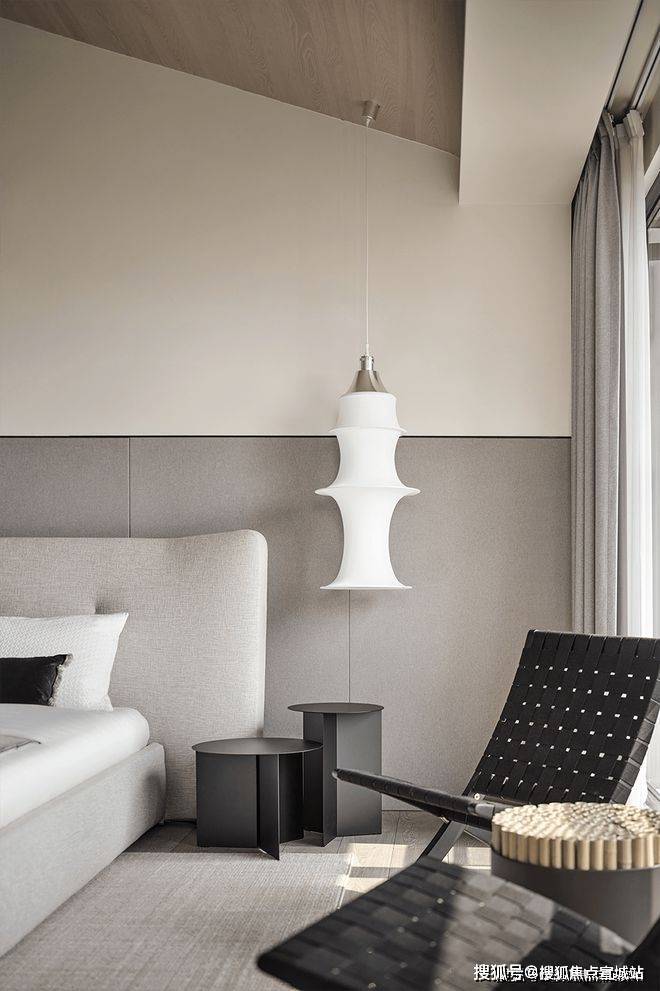 卧的斜形顶与整体空间相呼应,以质感深色作为主色调,营造出沉稳内敛的休憩氛围。