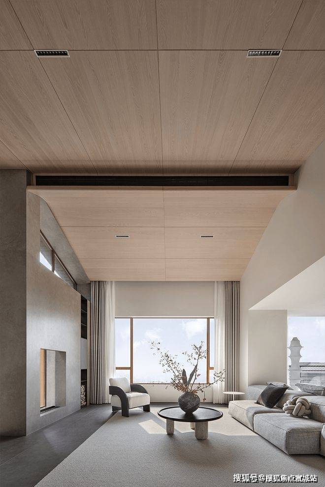 两面式沙发,打造出更随意的坐卧选择与舒适体验。木质吊顶铺展延伸,层次错落有致,仿若将室外的自然意境延伸到了屋内,简雅质朴而温润有加。