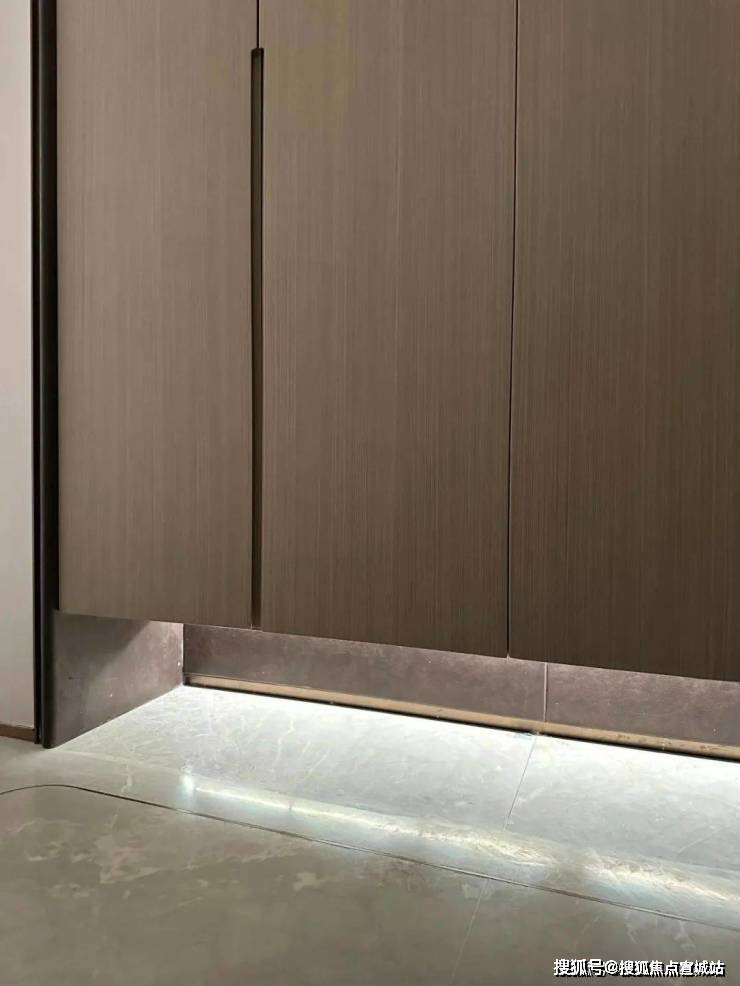 鞋柜下方做了悬浮处理,同样也是内嵌灯带,这里灯光的角度还会再调整,因为灯光映射在大理石地面上,要显得尽量柔和不刺眼;同时,鞋柜下方可放拖鞋,还能放扫地机器人,便于日常清扫打理。