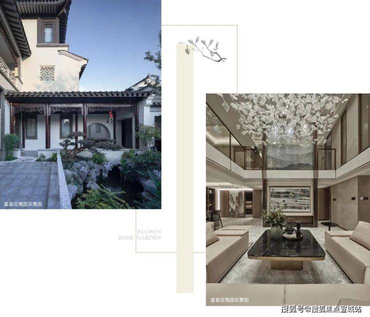 富春玫瑰园中国院子除传承绿城中式产品中的青瓦白墙、飞檐庑廊、影壁漏窗、水榭亭台等中式建筑元素外,为了不辜负从《富春山居图》中走出来的山水大境,在设计上我们还原苏州园林【园院宅阁】体系,极大限度的将富春山水收藏入室。