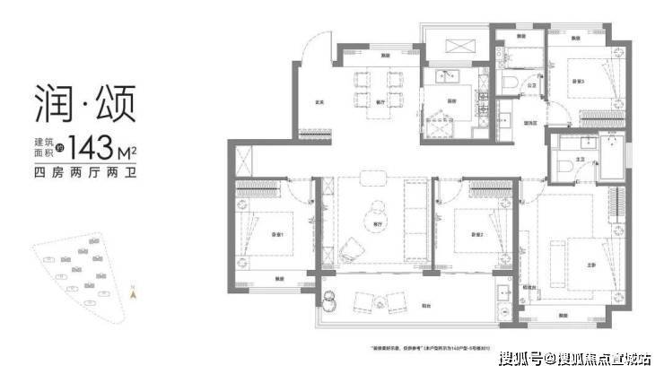 143㎡四室两厅两卫:得房率78%-82%,双阳台+独立家政间设计,总价约539-580万元