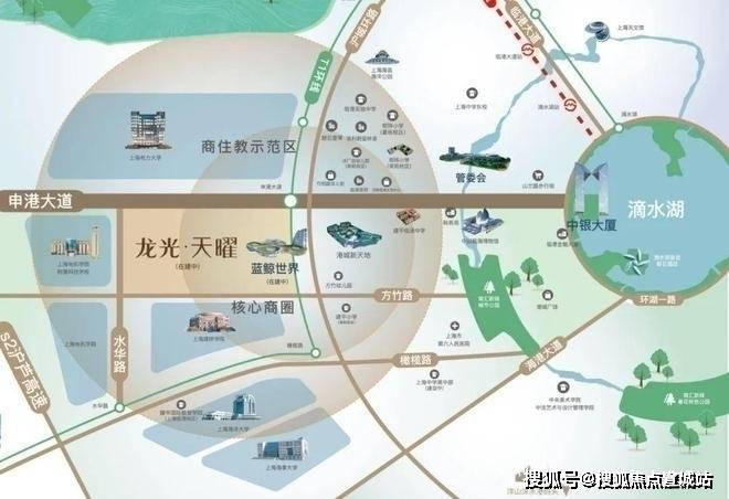 【龙光·天曜】就位于商住教示范区的门户核心位置,从上海市区自驾来临港,经S2沪芦高速(已全程免费)下闸道进入申港大道,首先映入眼帘的就会是滴水湖首个天际坐标——龙光蓝鲸世界百米酒店.这个酒店也是【龙光天曜】建面约50万方综合住区的商业配套部分.