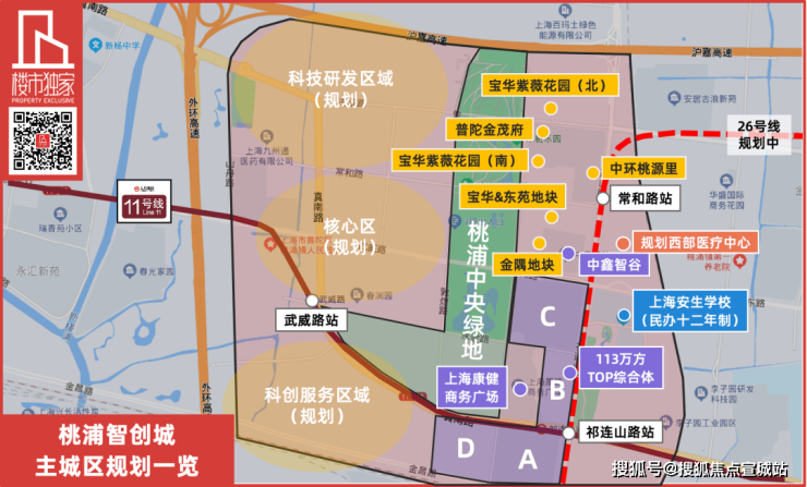 11号线祁连山路,2站即达三轨交汇的11/15/20(在建)上海西站(在建约10万商业)、3站真如(山姆+中海环宇城MAX+开心麻花剧场),5站进内环;地铁大环线26号线也已经在路上了,桃浦智创城在新地块设计方案审定中已经明确提出要征询申通意见,“保证地铁方案落实”👇