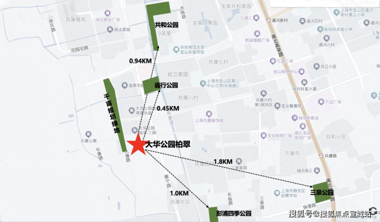 以及,4大城市公园。例如,约3万方庙行公园、约4.2万方共和公园、约2.7万方三泉公园以及约9.3万方彭浦四季公园,居住在此,可以尽情的享受公园生活。