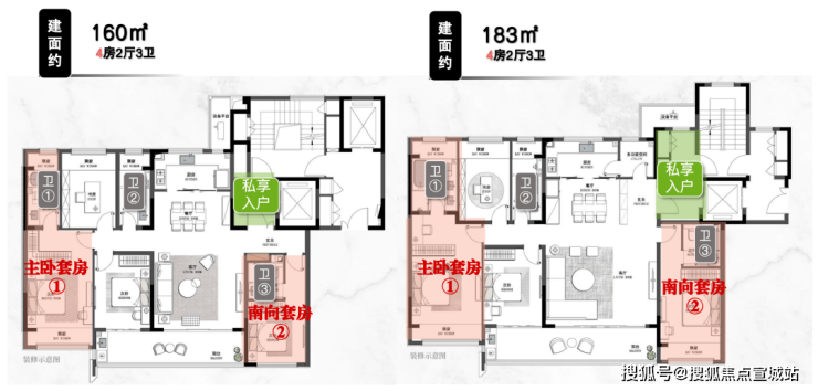 户型:有建面约 113㎡、143㎡、160㎡和 183㎡四种户型,分别为 3 室 2 厅 2 卫、4 室 2 厅 2 卫、4 室 2 厅 3 卫。