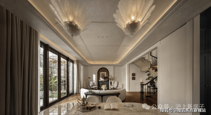 首层|家庭聚场:大开间横厅设计,全景落地窗,将阳光与园林景致最大化引入室内,实现“客厅-餐厅-花园”的无缝衔接,10人位沙发与8人宴客圆桌从容摆放,无需刻意规划便显大家宅邸的社交格局,无论是日常家庭欢聚,还是圈层宴请,都能尽显大宅气度。