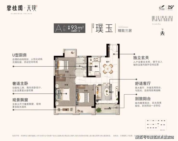 璞玉 A 户型:建面约 93㎡,三房两厅一卫。