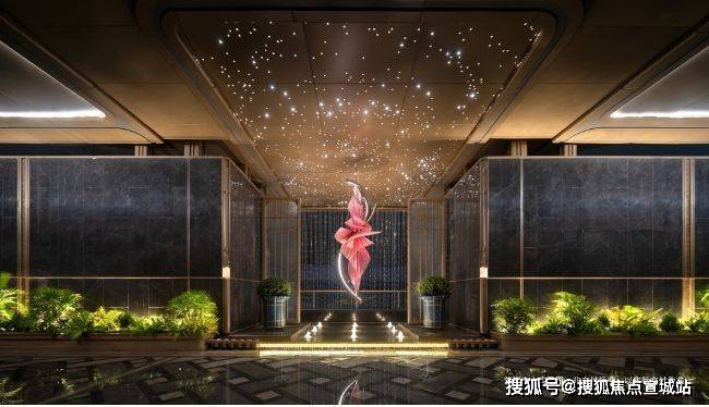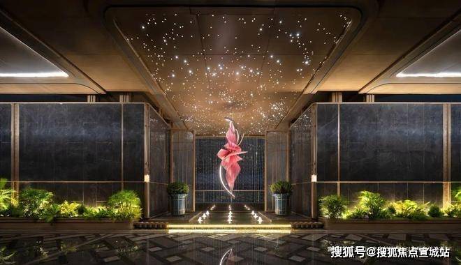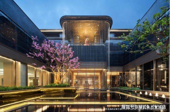 下沉式环幕庭院,跌水景观环绕,池底仿黑金砂与宝石晶片闪烁,点缀百余灯珠,师法“琉璃水光”形意,糅合视听五感,打造全浸式立体园境,天工巧夺,嘉定未见。