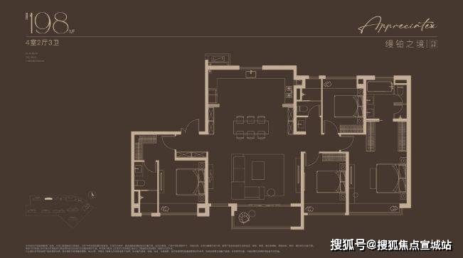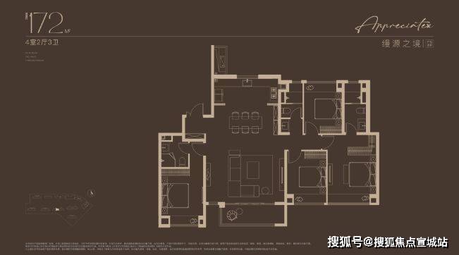 建面约172㎡4房户型,多娃家庭的进阶之选!奢阔尺度尽显家族气度!2梯2户,子母双开门礼序入户,私密尊崇门厅;约16米四开间朝南,搭配约6米尺度横厅,揽四时风景入怀。