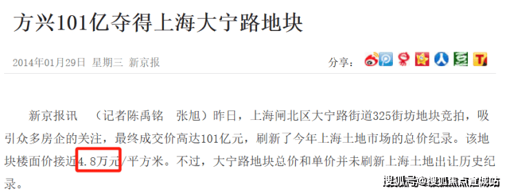 2014年1月土拍,上海闸北大宁地块出让,最终被金茂拿下,楼板价接近4.8万一平,甚至超越了周边的二手房价。