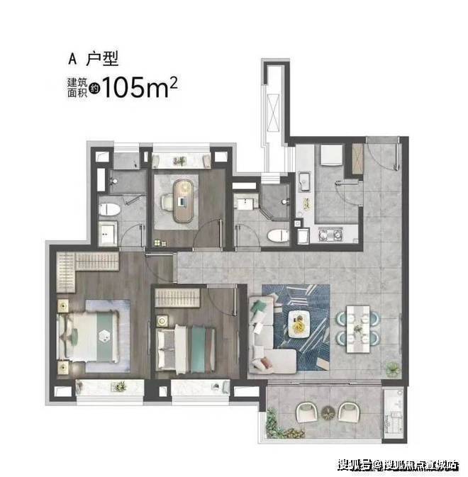 建面约105㎡为5.1米宽厅设计外接大阳台,这对黄金组合一方面撑开户内尺度,另一方面也让通风和采光俱佳。