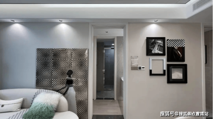 私密场域依旧保持静谧,黑白色基础上搭配了更多的色彩,例如深棕、浅紫等,艺术品的衬托深邃迷人,热络了家的氛围。