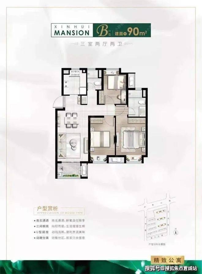建面约94㎡3房2厅2卫户型特点:同润·新云都会售楼处电话:400-882-8814【预约热线】☎做到了三开间朝南+主卧套房设计+全卧飘窗+动静分离+卫生间干湿分离,功能性与空间感完美结合的3房“神户型”。