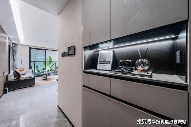 入户门设置玄关柜收纳体系,三段式设计,定制橱柜+石英石台面