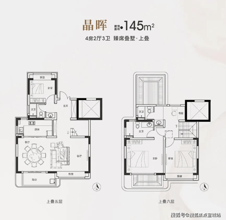 叠墅(145-163㎡四房):6F 上下叠设计,下叠带花园 + 约 83㎡地下室,上叠配露台,8 米大面宽,四房三卫,适配多代同堂。