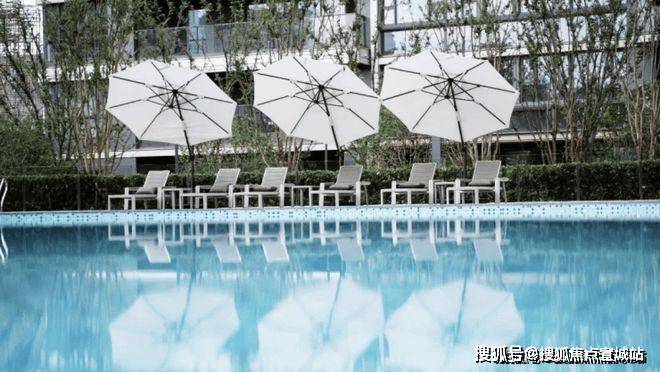●比如,戏水池旁精心搭配了造型躺椅,遮阳伞与湖水、绿树,营造出轻松休闲感。