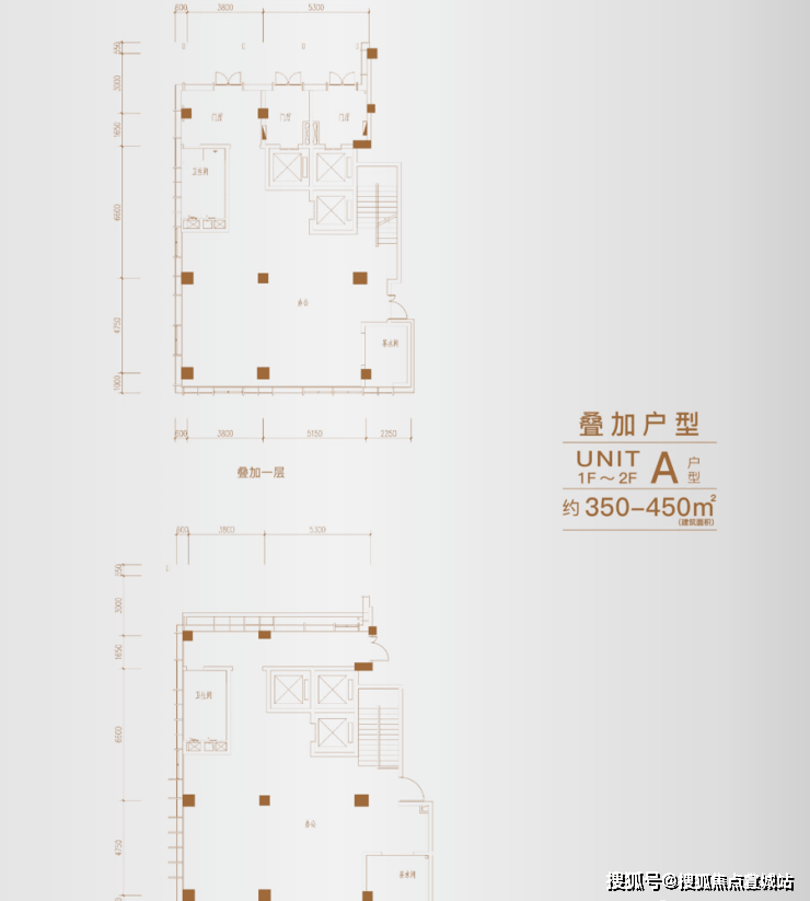 叠加商墅:350-450㎡(分下/中/上叠),下叠附赠60㎡地下室,上叠附赠150㎡露台