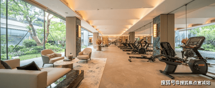 健身空间,搭配海派砖花地砖,极尽静奢风潮。大面积落地玻璃与下沉庭院的浓荫深度交融,或瑜伽、或健身,让心灵的在酣畅淋漓中重回宁静与自在。