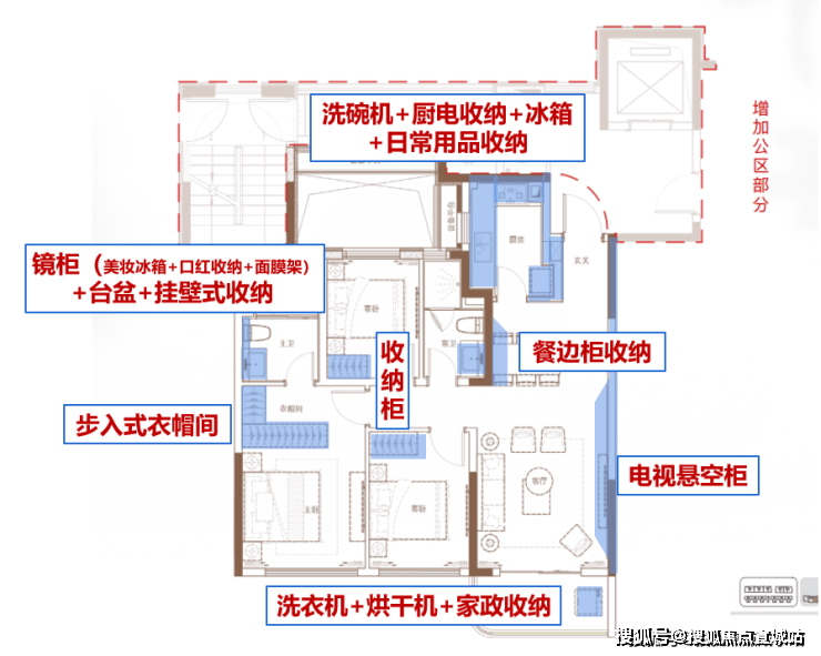 1、精细化收纳系统:全场景收纳,卫生间镜柜内含美妆冰箱、房门后有家政收纳空间、厨房的小家电区、衣帽柜收纳等等,这些一起解决了家庭的大部分收纳问题。