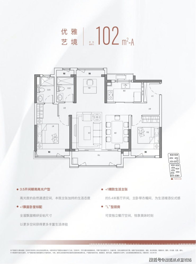 建面102㎡三房两卫:约5.4米横厅、3.5开间朝南,赠送约13㎡飘窗面积,客餐厅可容纳6-8人聚餐。