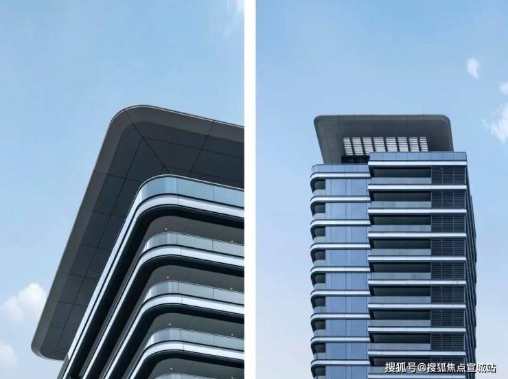 大面积LOW-E玻璃铺陈,内外通透,在整面的落地玻璃中可见“镶嵌”的飘板,在通透中更显得轻盈。辅以转角阳台与阳角灰色金属铝板精细收边,建筑边缘直线的利落与曲线的圆融形成反差,形成有趣的冲突感,以回应科技美学的多元化趋势,继而形成立面公建化的产品体系,令其在同质型项目中脱颖而出。