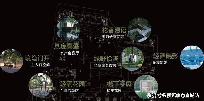 还能在归家的动线上体会到不同的景观节点:境隐门开(主入口空间)、悬廊叠瀑(水岸会客厅)、绿野拾趣(儿童乐园)、轻舞晓影(乐享氧吧)、樾下茶庭(宅前花园)、花香漫语(宅前会客花园)、轻氧花园(全龄活动区)。