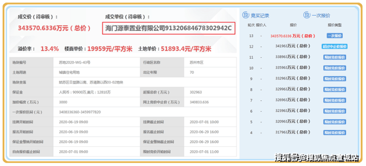在2020年7月,平江新城总共出让了3块地,他们分别倍首开、绿都、金科拿下,他们之后备案名分别叫璀璨平江如苑、绿都云起平江、金科映象平江,璀璨平江如苑地块以总价343570.63万元竞得,楼面价19959元/平米,溢价13.4%,