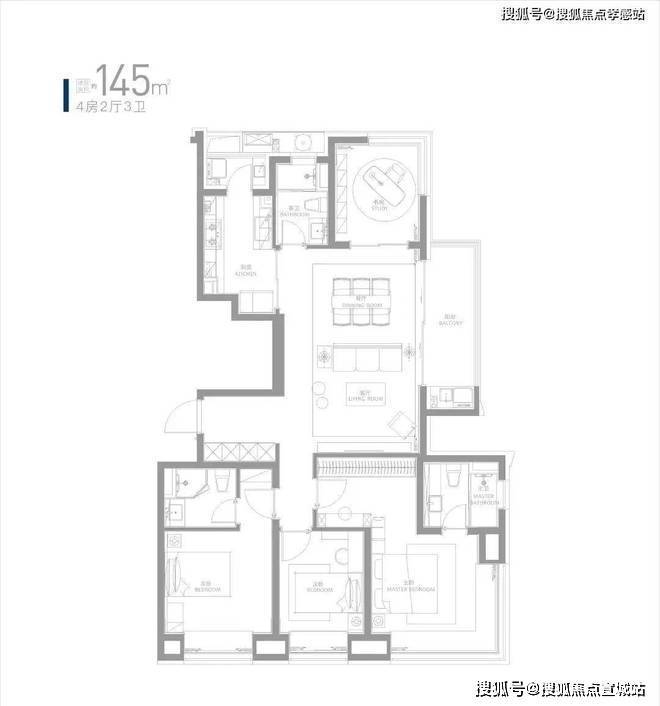 约145㎡四房,分布于景观楼王位置,可直面一线双水系河景。大横厅搭配270°景观视野,相当惊艳。