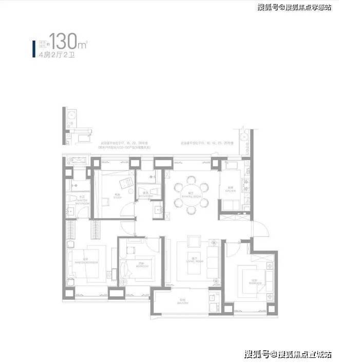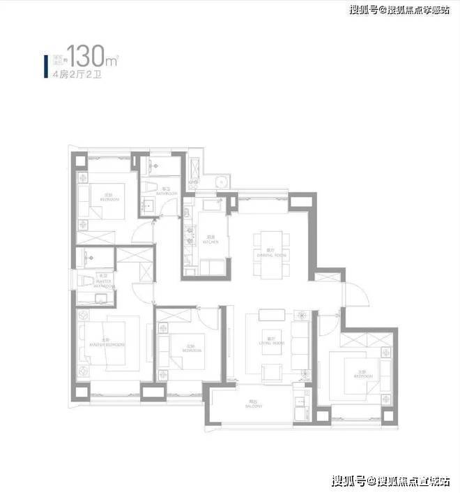 约130㎡四房,采用“飞机户型”设计,约13.5米整体面宽,拥享优秀光影与通透视野。