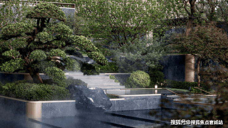 值得一提的是,伴月桥旁的“石瀑”,由10-20cm的特厚珍贵老石皮堆砌而成,最轻的就有百余斤,最重的则是超800斤,只为呈现层次感和厚重感。石瀑之下,点缀“鱼跃龙门”雕塑,融自然美与人工美于一体,还原宋画《纳凉观瀑图》之况味。