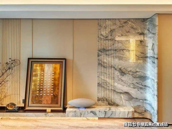 客餐厅方面,电视背景墙采用卡慕白石材+皮革,均为交付标准;地面采用简一(或同等品牌)的900*1800仿石砖,密拼施工,几乎看不到有任何缝隙——相信有装修经验的小伙伴一定知道,这种大砖的价格和这样的密缝工艺成本有多高!