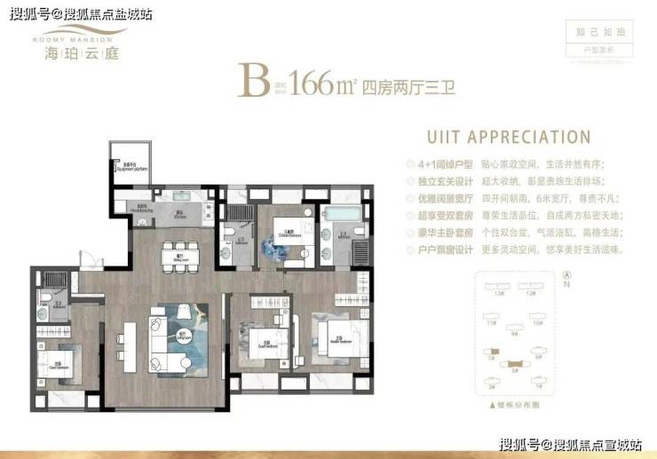 相较于142㎡户型,建面约166㎡户型改善更纯粹!四开间朝南+户户飘窗设计,采光面充沛,6m宽厅视野无遮挡;厨房连接家政间,家务动线合理;双套房设计,居住舒适度更高。