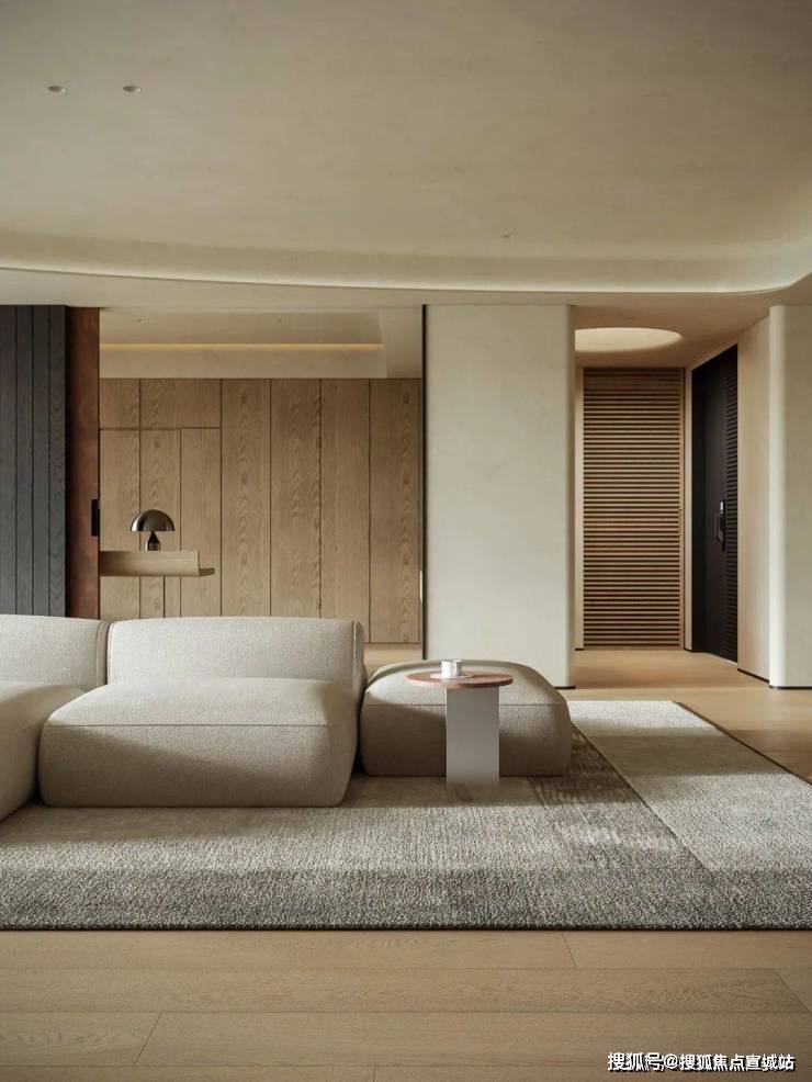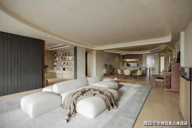 为营造自由通透的空间感,我们规划流畅生活动线。米灰色低饱和模块沙发,以多面体块拼接造型,灵活适配不同视角与布局,成为家庭核心区焦点。它与多功能房、餐厅、水吧等区域形成视觉呼应,构建出“平行陪伴”的温馨生活场景。