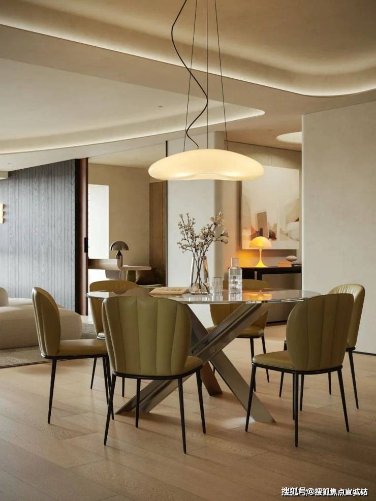 客餐厅以连贯视角奠定视觉基调,顶面弧线替代尖锐线条,贯穿空间削弱压迫感,延伸视觉开阔度。柔和暖色调交织出丰富层次,搭配弯曲线条勾勒轮廓,营造松弛宁静的生活氛围,弧线更成为串联空间的点睛之笔。