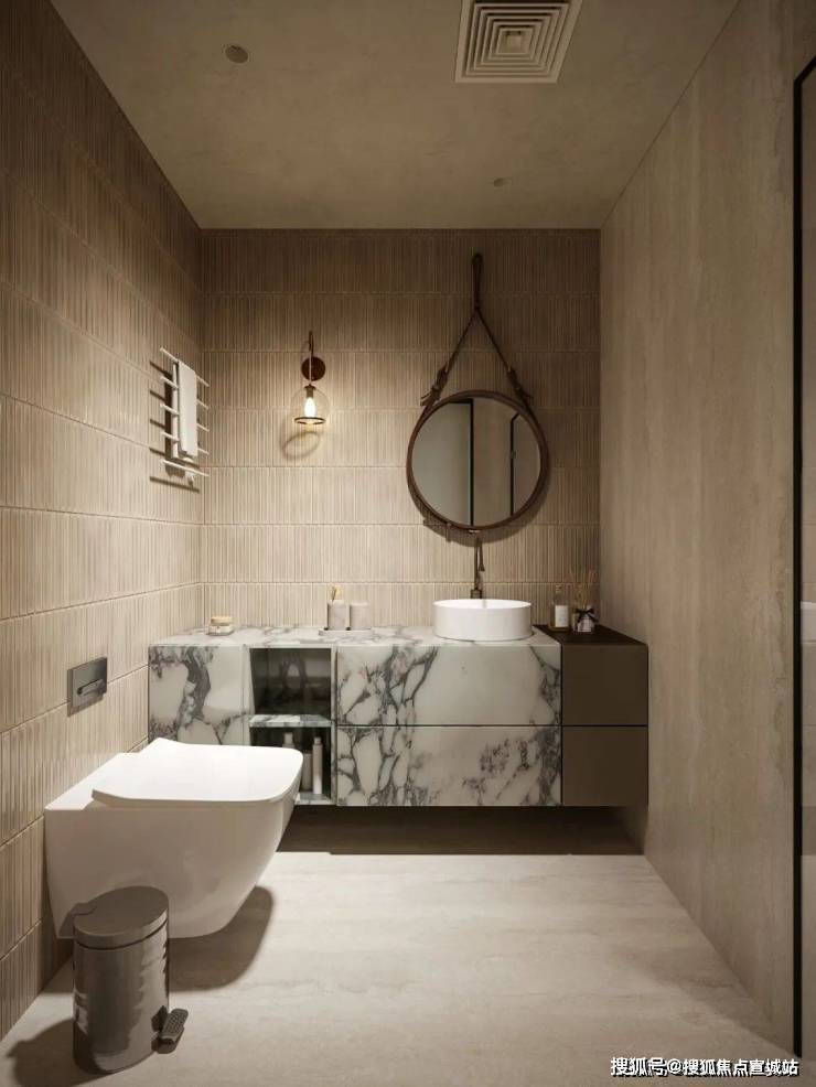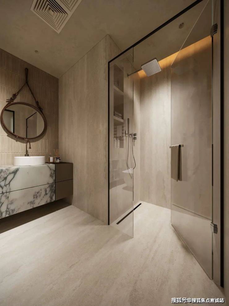 次卫通过墙体布局调整,拓展活动空间并提升收纳能力,延展洗手池增强使用便利性。在风格设计上,洞石砖与拇指砖搭配铺贴,洞石砖天然纹理彰显自然美感,同色系拇指砖打破单调,二者相辅相成,在有限空间内打造出兼具实用性与艺术感的卫浴空间。