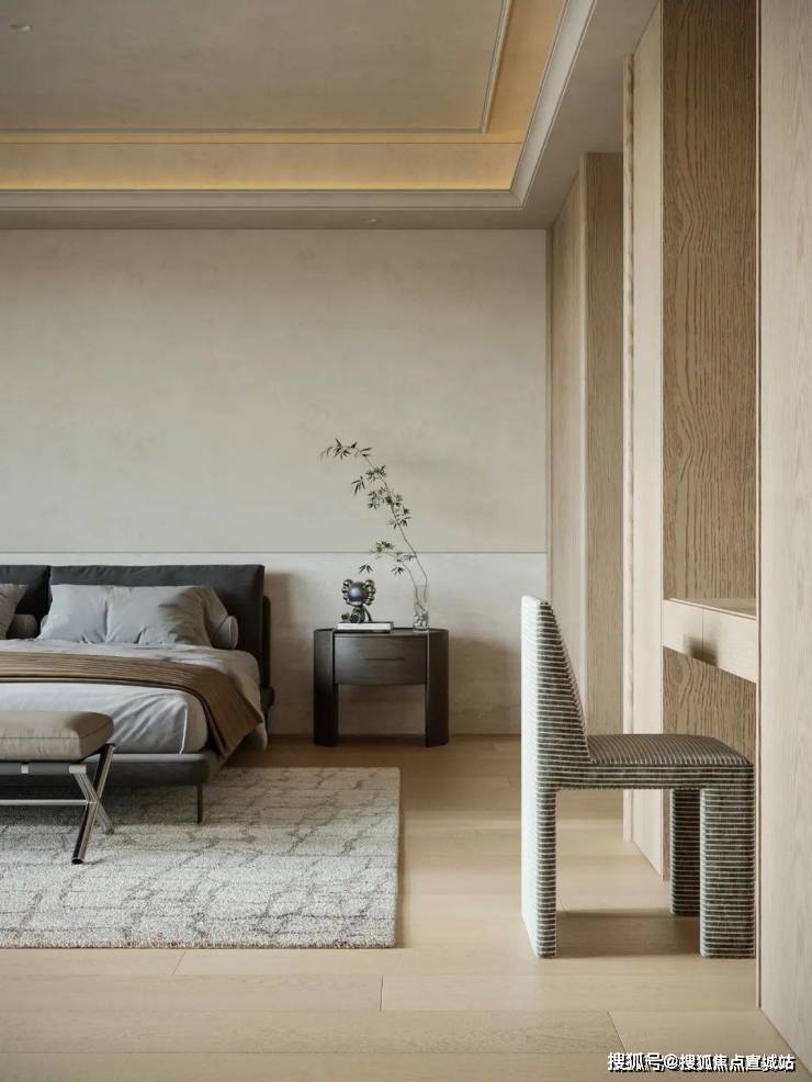 主卧采用留白设计,保留部分家具,摒弃繁复装饰与色彩堆砌,以形体美、轻重色和谐及精准功能布局满足家庭需求。洞石纹板与原生木色搭配,低饱和色调奠定幽远宁静基调。简练线条与天然材质纹理交织,褪去冗余,在素净空间中营造出温润的时光质感。