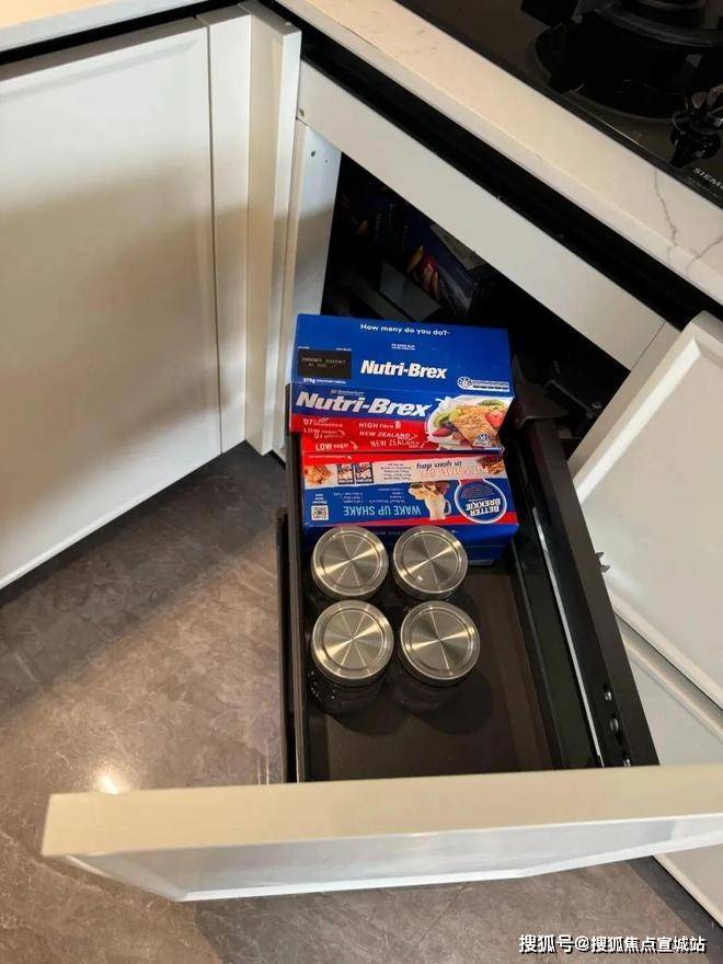 橱柜转角处的拉篮做了“轻松抽”,业主不必特别伸手探进去拿东西,非常省力。