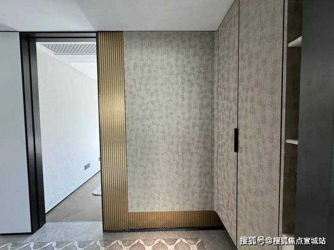 入户门是是非常有质感的铸铝门,上海【招商中旅观境】售楼处电话:400-8862-334【营销中心】中介勿扰带电子猫眼智能门锁;进门后是一个独立玄关,木纹玄关背景墙,右侧是通顶的悬浮玄关柜,上海【招商中旅观境】售楼处电话:400-8862-334【营销中心】中介勿扰内置鞋柜精灵和抽拉鞋架。