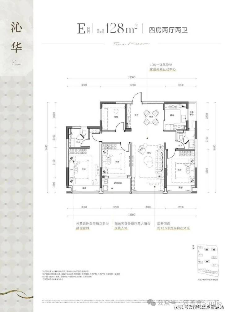建筑面积约128平方米的四室两厅双卫户型,设计巧妙,四开间均朝南,配备私密式阳台,享受充足的南向自然光照,营造出开阔而明亮的居住空间。