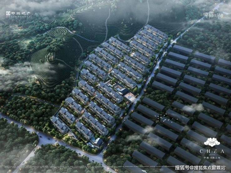 中海月陇云岚叠墅楼盘西侧北侧被茶山环抱,远离城市喧嚣,坐拥幽静山水之间。从窗户中可以看到壮观的山景,东侧没有遮挡,远处的茶山景观与满目翠绿的茶园让人感觉宁静祥和。