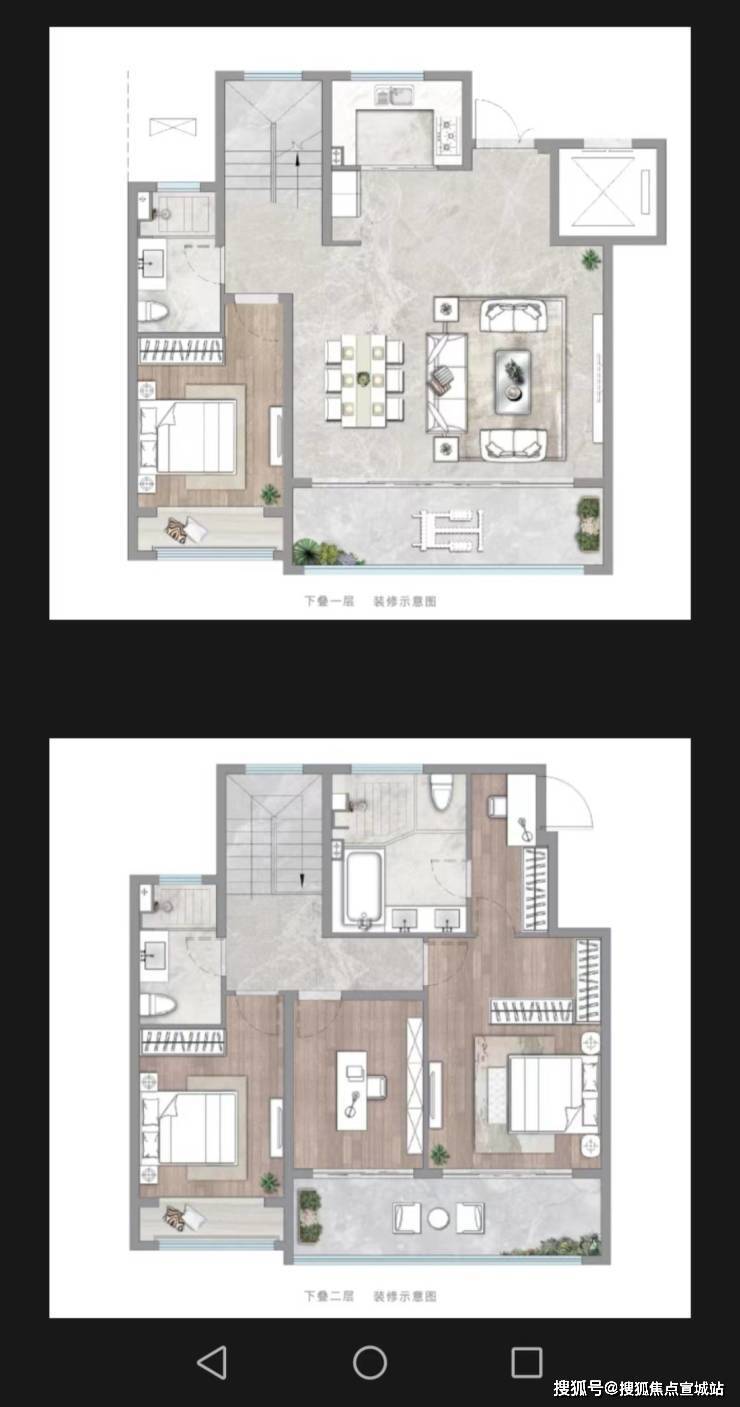 叠墅户型:上叠约 160㎡四房两厅三卫,带约 60㎡露台;下叠约 180㎡四房两厅三卫,带 40 - 100㎡庭院,同样为一梯两户设计,叠墅得房率约 91%。