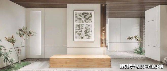 地上入户大堂采用中式经典构图方法——框景,打造未进门,先见景的效果。中国人一直讲究,生活中处处有景。框景的工艺就是能做到从任何一个框望过去都是景色,角度不同景色也不同,一步一景的效果。