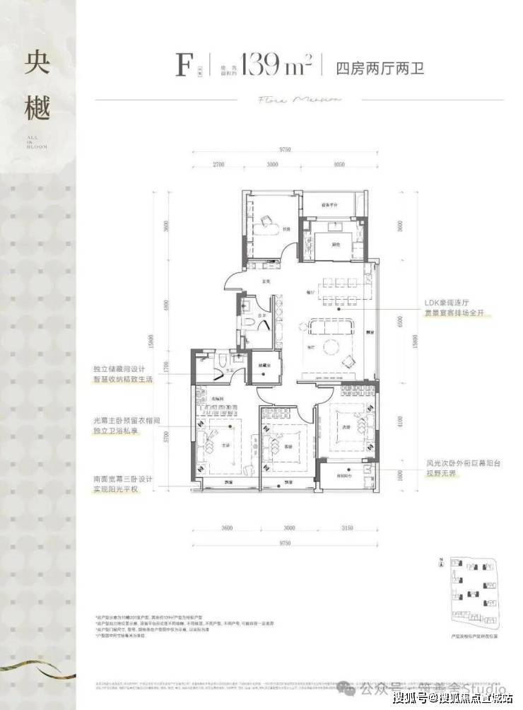 建筑面积约139平米四室两厅双卫户型,以其南向三卧室的宽阔布局、双飘窗与封闭阳台的独特设计脱颖而出。该户型占据小区景观资源核心位置,采用南北通透的整体设计,通风采光极佳。