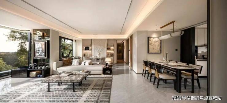 室内空间:引入了全屋智能家居系统,能通过App、中控、语音三大方式,调节全屋智能家居,包括客厅灯光、空调、地暖、新风、客厅和主卧窗帘等场景。
