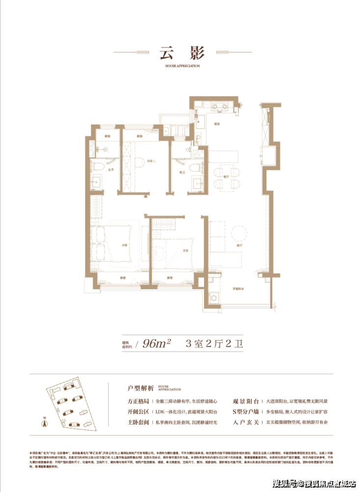 约 96㎡三房两厅两卫:全明通透,南向三开间,客厅、主卧、次卧全部朝南。客厅与餐厅一体化设计,连接南向观景阳台。厨房采用 U 型设计,操作台面宽敞。主卧配备独立卫浴,采用干湿分离设计。