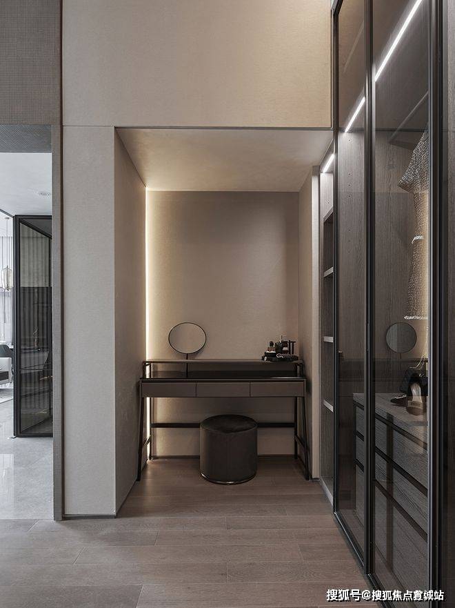 衣帽间在深色玻璃后方,浴室位于另一侧,靠近阳台的区域设有浴缸,灰褐色大理石与客厅空间相得益彰。