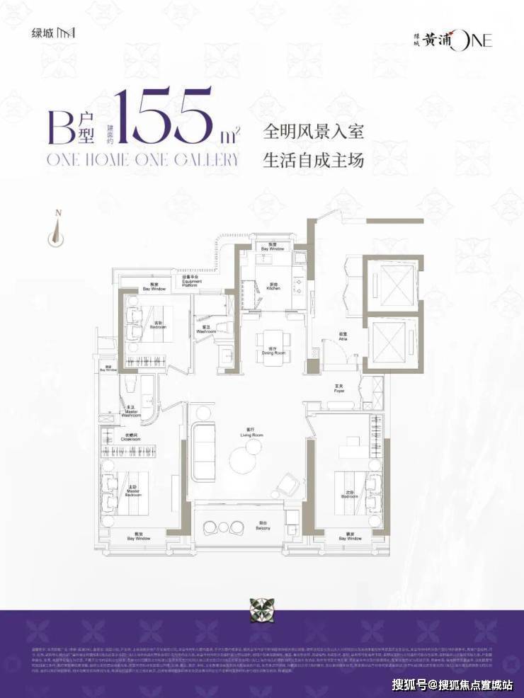 155㎡三房:三开间朝南,配备 6 米景观阳台,主卧套房达 25㎡,配备步入式衣帽间及五星级主卫,动静分区清晰。