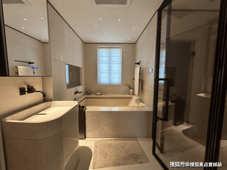 而样板间里这第二个卫浴空间,更接近于享受级。嵌入式浴缸,设计了魔镜系统,可以供业主泡澡时观影娱乐;除此之外,这个卫生间也有独立的淋浴房,并设计有桑拿房。