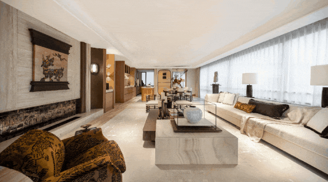 陶砚176㎡户型:取陶砚之自然璞实感,雕琢白冰玉的背景墙,客厅吊顶还原砚台造型,室内饰以瘦金体笔划装饰线条。