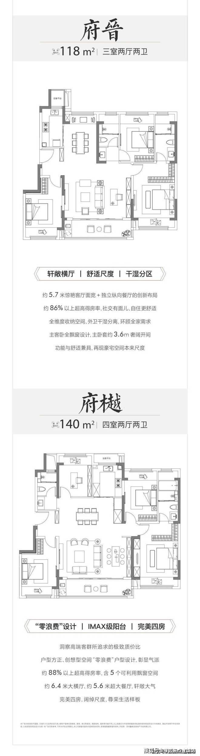 主力户型:有 101㎡、112㎡、118㎡的 3 居室和 140㎡的 4 居室。其中,101㎡户型三开间朝南,约 6.4 米双联阳台;118㎡户型四开间朝南,零过道布局,可升级四房,约 86% 得房率;140㎡户型为四叶草户型,约 6.5 米超宽横厅,可升级五房。